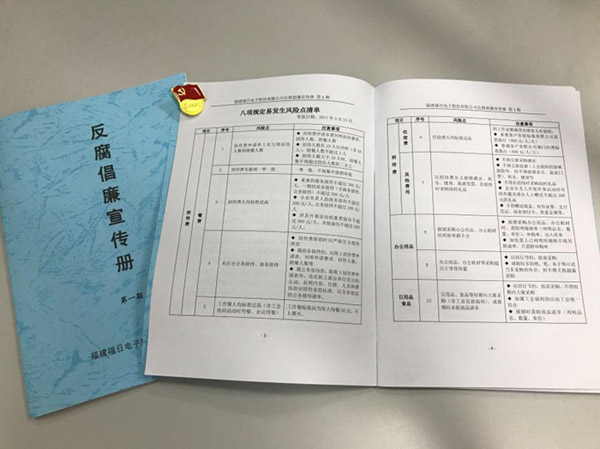 結合“兩學一做”學習教育常態化制度化,2017年上半年以來,福日電子黨委、紀委多形式多種渠道深入開展全面從嚴治黨教育。一是組織收看專題教育片《永遠在路上》,利用鮮活的案例教育和引導廣大黨員防微杜漸、警鐘長鳴;二是利用公司廉潔教育微信群平臺,不定期向企業中層以上領導干部及黨員推送教育警示文章,開展微黨課教育,提醒督促領導干部及黨員以身作則,嚴守“廉潔關”;三是在重要節假日等關鍵節點下發通知文件,持續重申中央八項規定精神和廉潔從業等有關紀律要求,及時開展自查自糾,廉潔過節;四是編印《反腐倡廉宣傳冊》,涵蓋遵守八項規定風險點、廉潔從業應知應會知識及行為規范、違紀案件警示錄等內容,使廉潔教育知識隨時可學可查,讓反腐倡廉真正融入廣大黨員、干部、職工日常工作、生活。