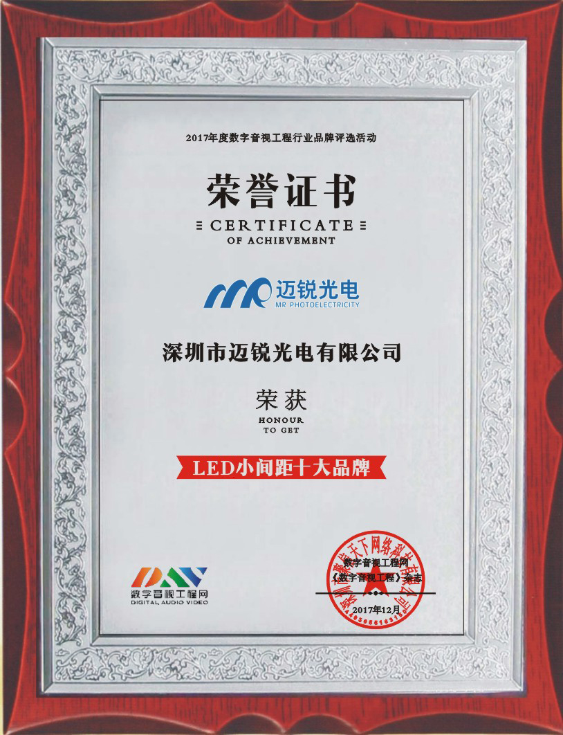 經設計院、經銷商、工程商、終端客戶等網絡無記名投票及數字音視工程行業的權威專家綜合評定,2017年12月,2017年度數字音視工程行業品牌評選活動圓滿結束,福日電子控股企業深圳市邁銳光電有限公司榮獲2017年度LED小間距十大品牌。本次活動由中國數字音視工程網、《數字音視工程》雜志主辦。
