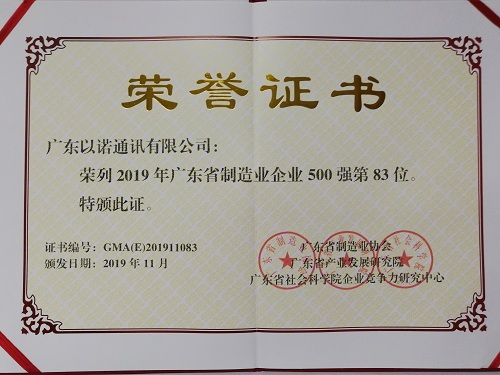 2019年11月13日,由廣東省制造業(yè)協(xié)會、廣東省產(chǎn)業(yè)發(fā)展研究院、廣東省社會科學院企業(yè)競爭力研究中心共同主辦的2019廣東省制造業(yè)發(fā)展年會暨廣東制造業(yè)500強企業(yè)峰會在廣州隆重舉行,會上發(fā)布了2019年廣東省制造業(yè)500強企業(yè)研究報告,福日電子二級控股子公司廣東以諾通訊有限公司榮列2019年廣東省制造業(yè)企業(yè)500強第83位。