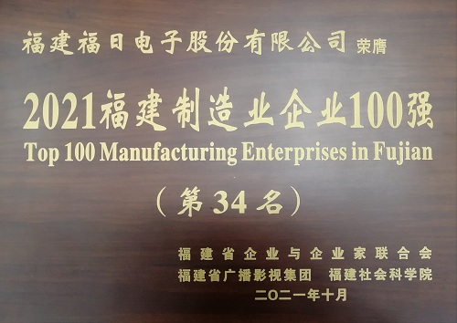 2021年11月3日,2021福建企業(yè)100強發(fā)布大會暨福建企業(yè)家大講壇活動在福州舉行。會上發(fā)布了2021福建企業(yè)100強、制造業(yè)企業(yè)100強、服務業(yè)企業(yè)100強等榜單,福日電子入選2021福建制造業(yè)企業(yè)100強(第34名)。