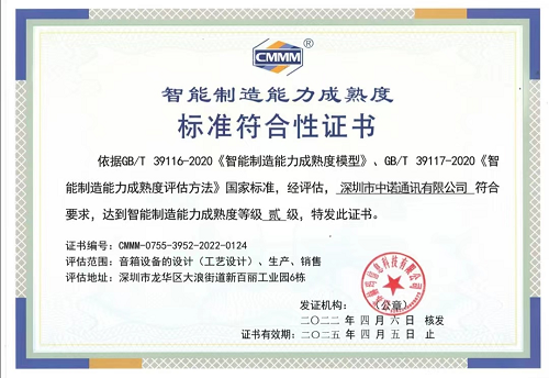 2021年9月-10月,由電子標準院授權江蘇赫瑪信息科技有限公司組建團隊,基于GB/T 39116-2020《智能制造能力成熟度模型》、GB/T 39117-2020《智能制造能力成熟度評估方法》國家標準,對中諾通訊新百麗工業園從工廠設計、產品研發、工藝設計、計劃與調度、生產作業、倉儲配送、質量管控、設備管理、安全管控、能源管理、環保管理等20個能力子域的智能制造能力成熟度,通過人員交流、現場巡視、系統查看等方法進行評估,認定該公司智能制造能力成熟度達到貳級水平,得到國家認可。