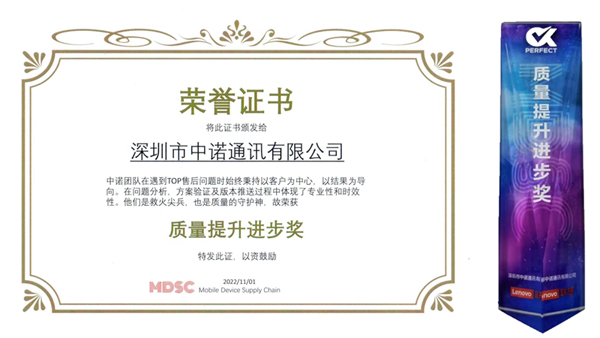 近日,2022年聯想供應商質量論壇主題分享及年度頒獎在線上拉開帷幕,福日電子成員企業深圳市中諾通訊有限公司在線上出席了此次活動?!敖臣壹甲钋?,能工事尤精”,今年中諾項目的售后返修率TCRR指標滿足目標要求并持續降低,在本次論壇中獲得多次表揚,并榮獲“聯想2022年度質量提升進步獎”。